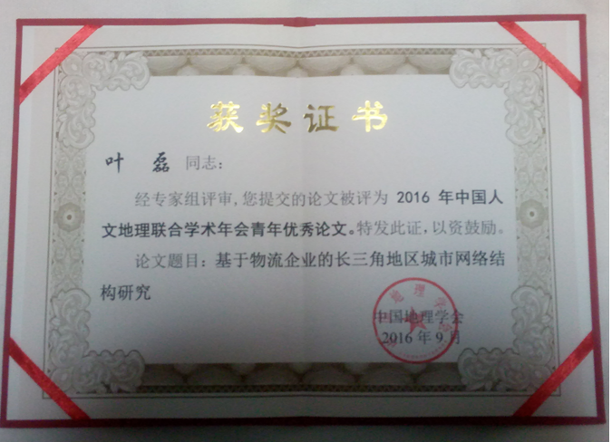 大会组委会从提交的300余篇学术论文评选出了20篇优秀论文,获奖者包括1位副教授,4位青年教师,10位博士研究生及5位硕士研究生。bat365官网青年教师叶磊提交“基于物流企业的长三角地区城市网络结构研究”获中国地理学会颁发的“2016年中国人文地理联合学术年会青年优秀论文奖”。