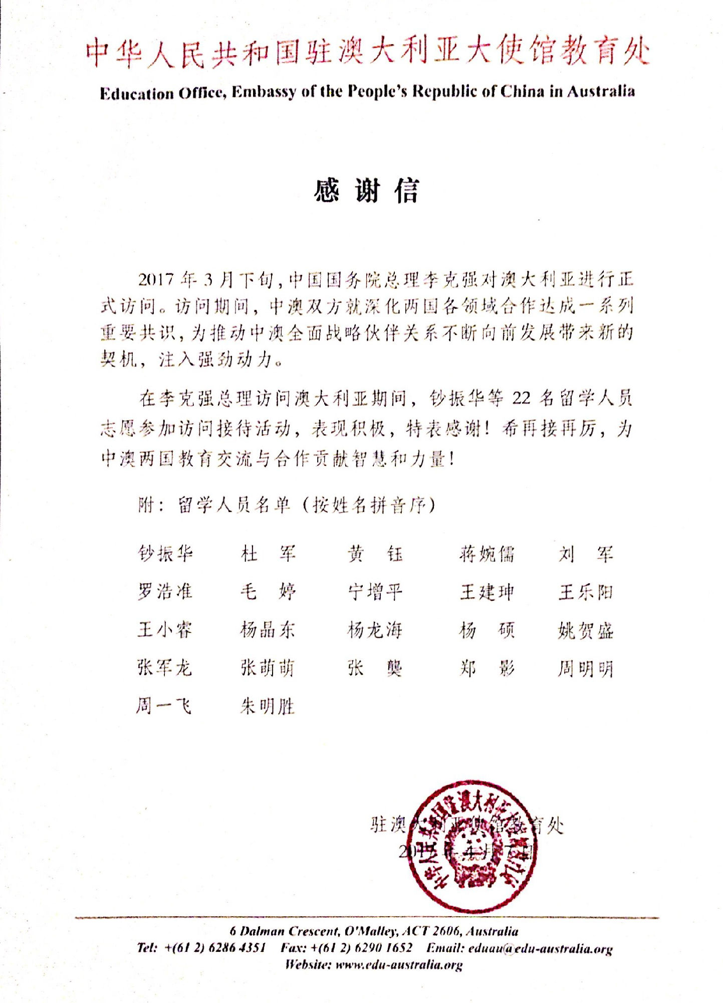 2017年3月下旬,中国国务院总理李克强偕夫人程虹教授对澳大利亚进行了正式访问。在李克强总理访问澳大利亚期间,bat365官网访学教师钞振华与其他21名留学人员作为志愿者参加了访问接待活动,为中澳两国教育交流与合作贡献了智慧和力量。日前, 中华人民共和国驻澳大利亚使馆教育处致信钞振华老师等,感谢他们在李克强总理进行访问期间,作为志愿者参加接待工作,表现积极,钞振华老师的积极表现从一个侧面宣传了bat365在线中国官网登录入口和bat365在线中国官网登录入口地科院,彰显了“崇真尚美,通精极致”的通大人特质。