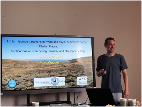 Dr.Marc在报告中介绍了Li同位素在风化过程中的分馏原理,以青藏高原地区河流和河流沉积物研究为例,详细介绍Li同位素在示踪青藏高原隆升、风化过程及气候变化中的应用。