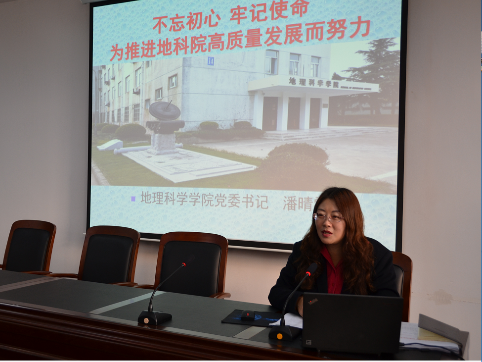 11月13日下午,bat365在线中国官网登录入口党委书记潘晴雯以《不忘初心、牢记使命,为推进地科院高质量发展而努力》为题,为全体党员上了一堂主题教育专题党课。