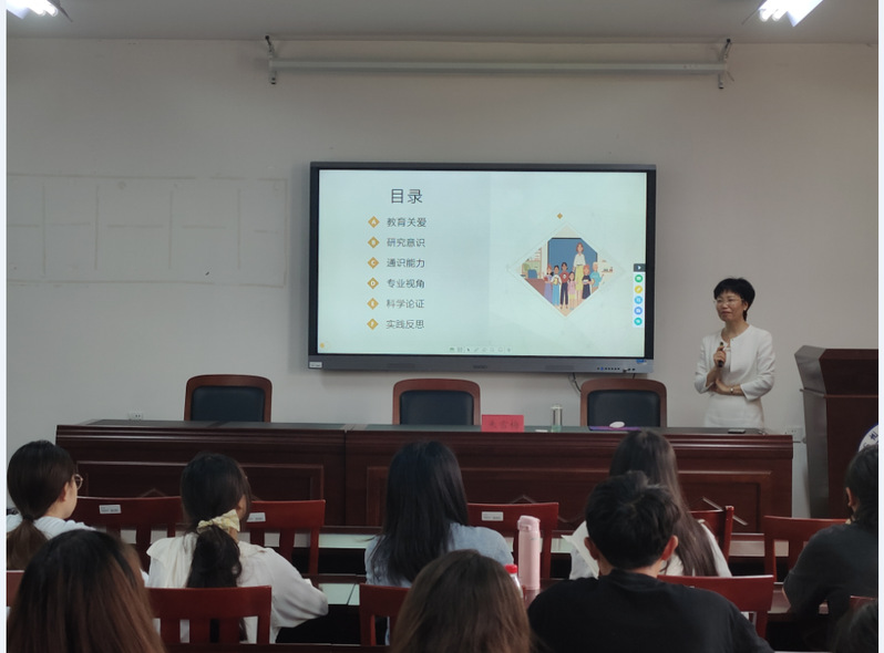 接着,朱雪梅教授结合自身丰富而扎实的教学教研经验,提出了“教育关爱、科学论证、专业视角、通识能力、研究意义、实践反思”六大相互联系、相互促进的论文创作的核心素养,阐述了关于写作素养的深刻认识和独到见解。