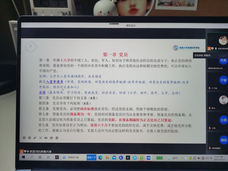 本次培训采用线上会议的方式进行。学生第一党支部书记、2021级辅导员李宇辉从大学生常见的入党动机误区入手,端正了新生的入党动机;带领全体新生学习了《中国共产党章程》,重点解读了党的性质、行动指南、现阶段我国社会的主要矛盾、党在社会主义初级阶段的基本路线、“两个一百年”奋斗目标、党的建设必须坚决实现的五项基本要求、党的初心和使命等内容;同时就入党申请书、自传、思想汇报等入党相关材料的撰写进行了详细说明。