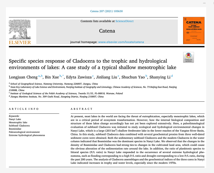 在国家重点研发计划项目、国家自然科学基金项目和科技部基础性工作专项等项目的联合资助下,程龙娟博士与南京地理与湖泊研究所薛滨研究团队合作以长江下游一个典型的中营养化湖泊——南漪湖为例,全湖采集三个点位的沉积岩芯和季节性水体样品,着重分析沉积物和水体中微型甲壳类浮游动物枝角类的群落组成与丰度特征,并结合地球化学指标和以210Pb137Cs为基础建立的年代框架,探究南漪湖枝角类属种结构的长期演变特征及其对湖泊内部营养和水文环境变化的响应研究。本项研究结果表明,以象鼻溞属为代表的枝角类是南漪湖的优势种;象鼻溞及枝角类总浓度的变化与湖泊营养盐浓度增加、南漪湖周边耕地面积变化、极端水文事件关系密切;分析结果揭示了南漪湖正处于中营养水平向富营养化转变的关键期,尤其是自20世纪70年代以来湖泊营养水平和水位均有所上升。因此,应尽快采取有效的管理措施,以遏制南漪湖富营养化的加剧态势。相关研究成果发表在国际知名期刊Catena(地学一区,Top上。