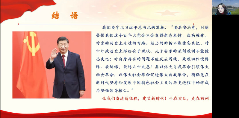 潘晴雯同志以《牢记初心使命 深刻领悟自我革命的内涵和本质要求——学习贯彻党的二十大精神》为题,从回顾百年党史中历次意义重大的自我革命事件以及深刻领悟自我革命的内涵和本质要求两方面做了深入地阐述。她回顾了八七会议、遵义会议、延安整风运动、七届二中全会、十一届三中全会、十八届六中全会、党史学习教育动员大会、十九届六中全会这些百年党史中具有重大意义的自我革命事件,从中国共产党的政治品格和本质属性、新时代全面从严治党成功经验、探索跳出治乱兴衰历史周期率得出的全新答案、党和国家战略全局等方面阐述了把握党的自我革命战略思想,深刻领会了以伟大自我革命引领伟大社会革命的重要要求。最后希望大家奋进新征程,建功新时代,能干在实处,走在前列。