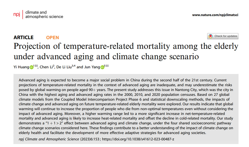 近日,bat365在线中国官网登录入口黄翌副教授与广州医科大学公共卫生学院杨军教授、澳大利亚新南威尔士初级产业部及新南威尔士大学气候变化研究中心刘德立研究员等合作,在气候与大气科学领域的国际著名学术期刊《npj Climate and Atmospheric Science》(《npj气候与大气科学》)发表题为“Projection of temperature-related mortality among the elderly under advanced aging and climate change scenario(人口高龄化和气候变化情景下老年人气温归因死亡预测)”的研究论文。