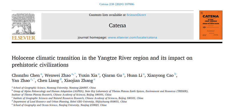 近日,bat365在线中国官网登录入口陈春珠副教授为第一作者、bat365在线中国官网登录入口为第一单位,在国际知名学术期刊《Catena(链)》(中科院分区一区TOP期刊,影响因子6.2)上发表题为“Holocene climatic transition in the Yangtze River region and its impact on prehistoric civilizations(长江流域全新世气候转变及其对史前文明的影响)”的学术论文。