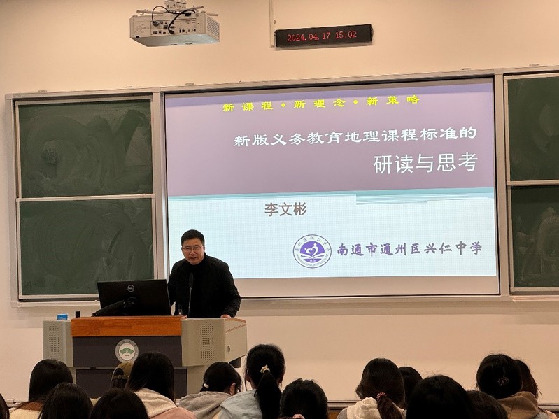 4月17日下午,bat365官网地理科学(师范)专业2022级全体本科生及学科教学(地理)专业硕士研究生在39号楼A101教室,聆听了bat365官网校外兼职教师——通州区兴仁中学李文彬校长题为《新版义务教育地理课程标准的研读与思考》专题报告。