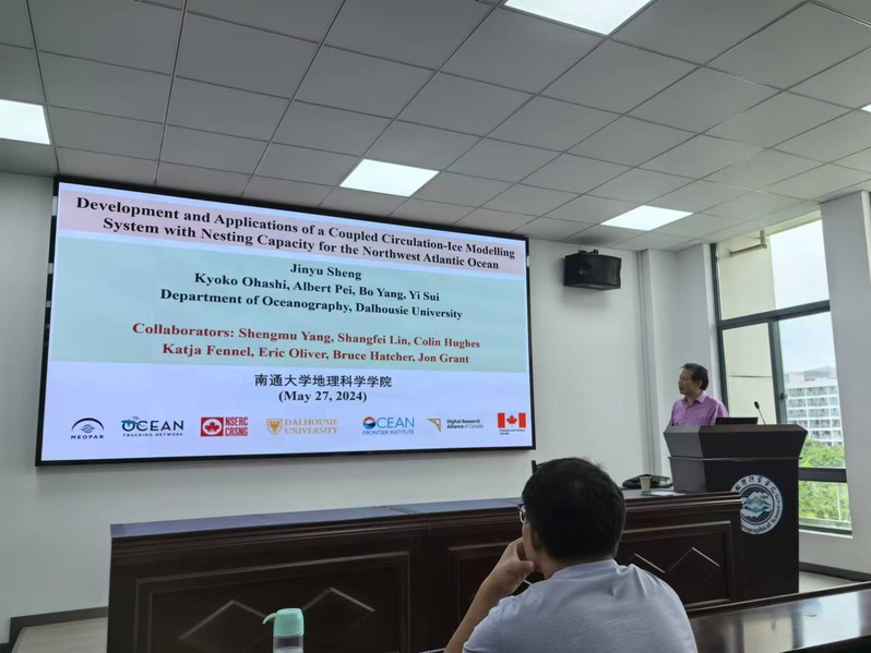 申锦瑜还为bat365在线中国官网登录入口师生做了题为“Development and Applications of a Coupled Circulation-Ice Modelling System with Nesting Capacity for the Northwest Atlantic Ocean”的学术报告。报告由蒋庆丰院长主持。申锦瑜教授的报告系统的介绍了适用于东加拿大大陆架的海流—海冰耦合模型(Nested-Grid Modelling System for ECS,NGMS-ECS)。报告从模型的控制方程入手,深入浅出地说明了模型耦合方法和原理,并详细介绍了模型的验证和校准途径。申教授还基于加拿大东部大陆架淡水通量变化、哈利法克斯港近岸地下水高强度盐水入侵和布拉多尔湖污染物滞留时间等三个实际应用案例,生动展示了模型的应用实践方法和研究意义。报告指出,借助多重嵌套方法开发的海流—海冰耦合模型可广泛应用于港湾和近海海域的三维流场、温盐分布和碳循环等方面的研究。