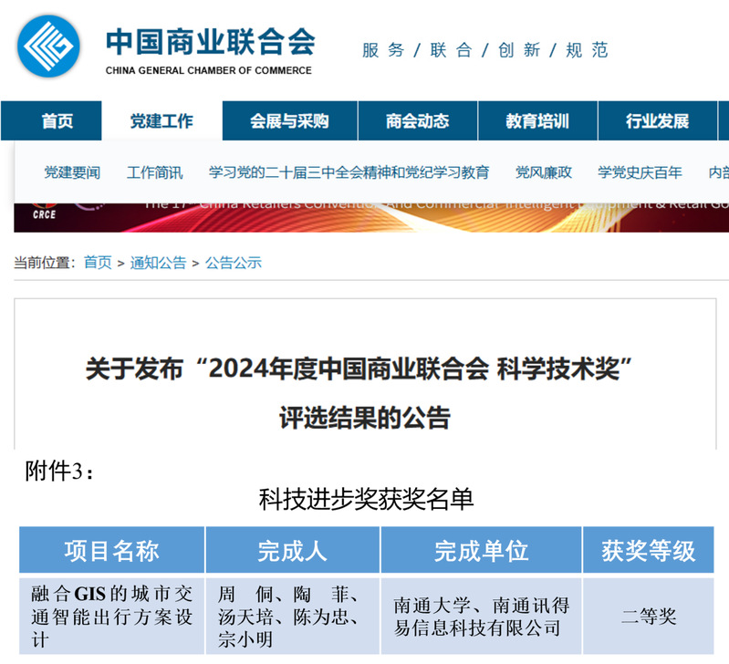近日,“2024年度中国商业联合会科学技术奖”评审结果公布,bat365官网成果“融合GIS的城市交通智能出行方案设计”荣获科技进步奖二等奖。“中国商业联合会科学技术奖”是经国家科技部、国家科学技术奖励工作办公室批准设立的权威奖项,具备提名、推荐国家科学技术奖资格。奖项旨在表彰在全国商业行业的科学研究、技术创新、成果推广以及高新技术产业化等方面做出卓越贡献的单位和个人。
