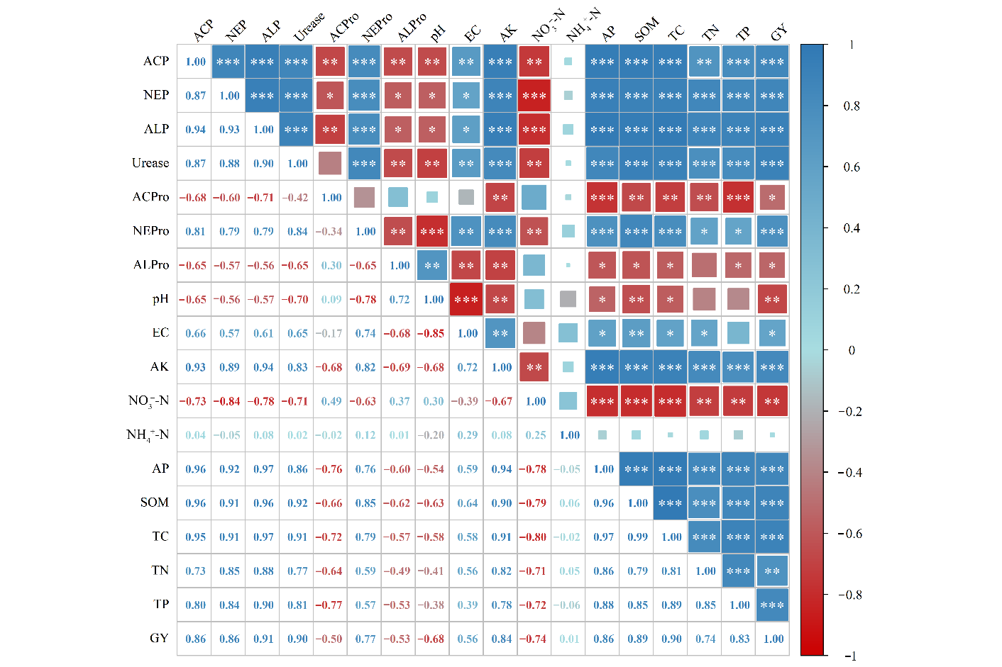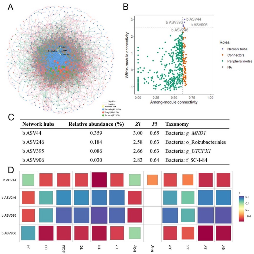研究结果显示,与单纯化肥施用相比,仅有机肥或有机肥+化肥处理显著提高了土壤有机质、总碳、总氮、有效养分(如有效磷、有效钾)的含量,并显著提高了作物产量。与此同时,有机处理增强了土壤细菌与真菌的α-多样性,并重塑微生物群落(细菌、真菌、古菌)结构,使其明显区别于长期单用化肥或不施肥的土壤。此外,相关统计分析表明,土壤总碳、总氮、有机质及有效磷是驱动微生物群落变化的关键环境因子。共现性网络结果表明,有机肥通过关键细菌“keystone taxa”(如MND1、Rokubacteriales、UTCFX1、SC-I-84)调控碳氮营养转化,增强土壤生态功能与养分循环能力。功能基因预测揭示,与N和P循环相关的功能基因丰度在有机肥和化肥处理之间也表现出明显的不同。有机肥对土壤N和P的酶促转化潜力(如磷酸酶、尿素酶、中性蛋白酶)也明显加强,表明土壤养分循环与有机质矿化能力得到显著提升。