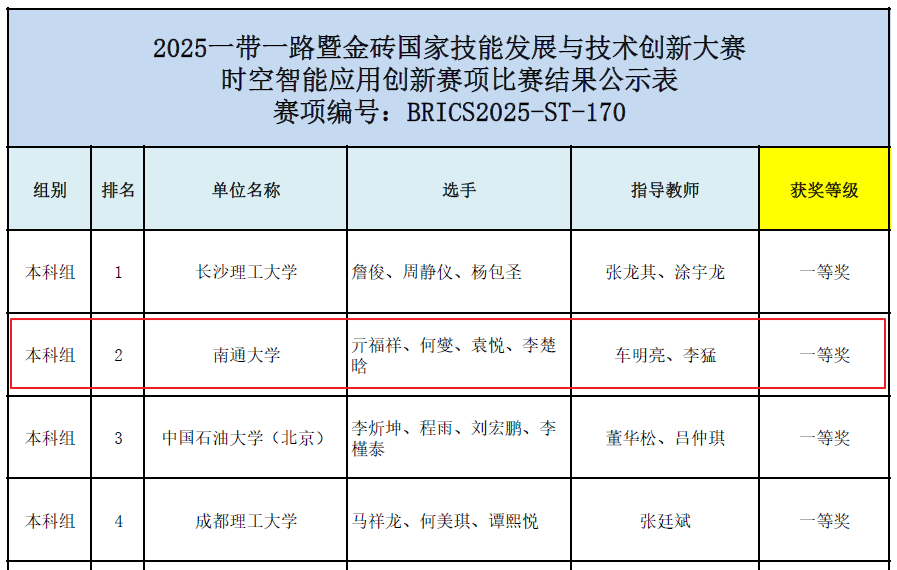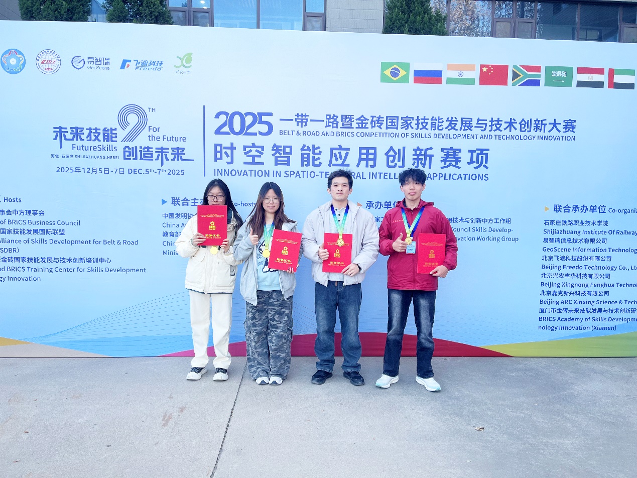 近日,2025一带一路暨金砖国家技能发展与技术创新大赛(下称金砖大赛)时空智能应用创新赛项全国总决赛在河北省石家庄市举行,来自全国100多支参赛队伍同台竞技。bat365官网代表队(2024级亓福祥(队长)、2023级何燮、2024级袁悦、2024级李楚晗)凭借过硬的综合实力在比赛中表现出色,荣获金牌(全国一等奖第二名)。同时,车明亮、李猛老师被大赛授予“优秀指导教师”荣誉称号,我校荣膺“优秀组织奖”,实现了竞赛成绩与精神文明的双丰收!