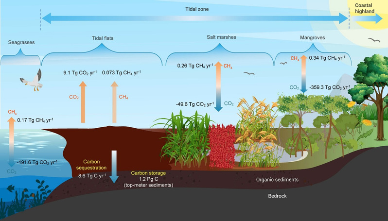 图1 滨海无植被滩涂和蓝碳生态系统碳固存与排放通量