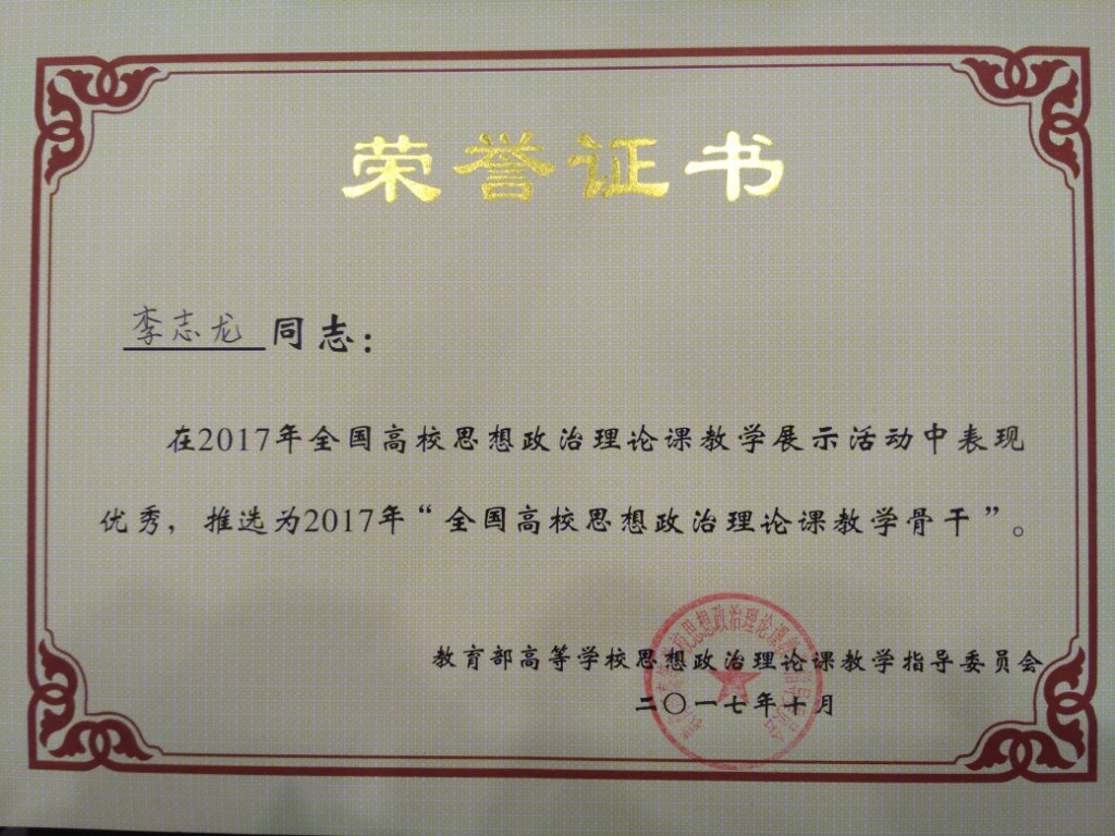 今年会教师李志龙荣获“全国高校思想政治理论课教学骨干”荣誉称号