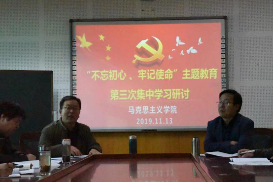 随后进行交流研讨,各位院领导结合个人自学与集中学习情况谈认识、讲体会、摆问题、找差距。王银书记认为要全面把握党的十九届四中全会决定提出的总体要求和目标任务,着力提升制度和治理体系建设水平,对需要坚持和巩固的,要坚定不移、自觉践行;贾绘泽院长认为还需加强制度监督,加强制度监督是强化制度执行力的保障。真正使一项好的制度成为执行者的行为规范和自觉行动,既要靠制度本身的约束力、强制力,更要靠来自各方面的监督检查;孙学虎副书记认为应加强工作的行动力与执行力,按期完成各项工作任务,及时解决发现的问题,务必做到立行立改;王艳副院长认为党员领导干部要发扬斗争精神、增强斗争本领,学懂弄通做实党的创新理论,夯实思想根基。理论上清醒,政治上才能坚定,斗争才有底气、有力量;赵改萍副院长认为要深学细照笃行,坚定“四个自信”,坚守初心使命,强化责任担当,切实服务师生,改进工作作风,使思想政治理论课课堂成为坚持党的领导的坚强阵地。