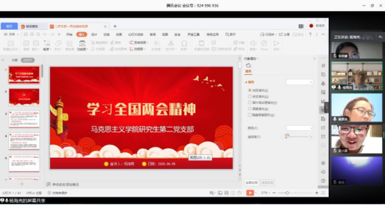 首先,杨海亮书记从三个方面解读了两会精神。一是认真梳理习近平总书记在此次全国两会中的多次重要讲话,包括参加全国人大内蒙古代表团审议时的讲话、看望参加政协会议的经济界委员时的讲话、参加全国人大湖北代表团审议时的讲话、出席全国人大解放军和武警部队代表团全体会议时的讲话等。二是解读李克强总理作的《政府工作报告》,帮助与会党员准确理解了报告的精神实质。三是杨书记传达了山西省委和今年会官方网站党委关于2020年两会精神的要求与部署。其次,杨书记就近期支部工作进行了安排部署,要求支部采取线上线下方式营造两会精神学习氛围,要在各项具体工作中强化两会精神贯彻实效,实实在在做到“两个维护”,在支部严格落实全面从严治党。最后,杨书记对毕业生党员组织关系转接等事宜进行了答疑。
