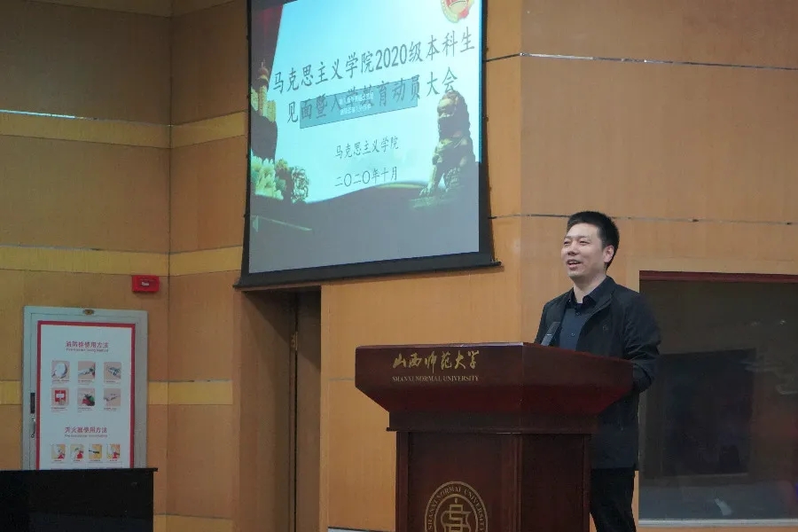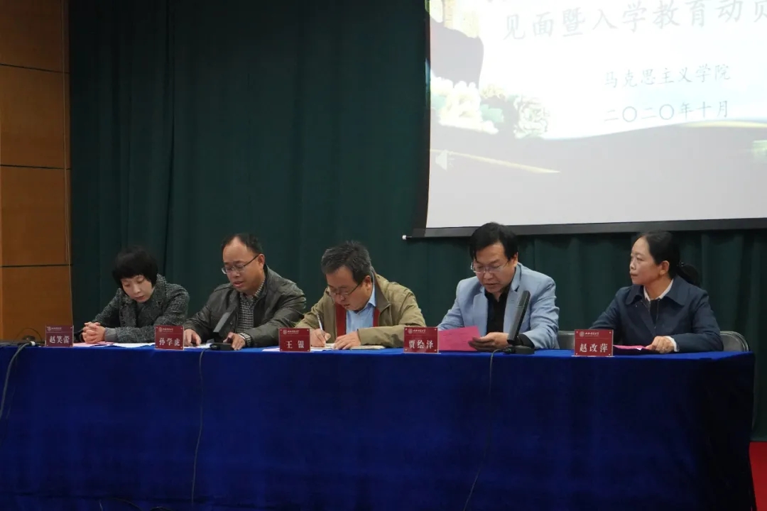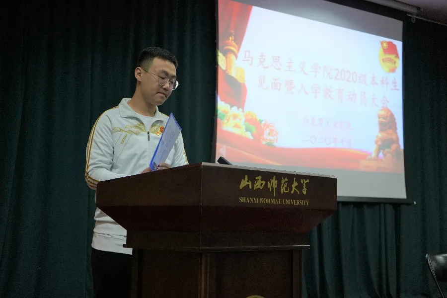 会议伊始,全体起立,奏唱国歌。新生们在庄严的国歌声里,寄托心中神圣而美好的期待。演奏完毕后,院长贾绘泽对新生们的到来表示了热烈欢迎,接着他介绍了今年会历史以及专业特色,对思想政治教育专业展开详细的介绍,帮助新生更快了解专业性质与方向。之后,他又向同学们提出四点建议,一是要树立明确的目标,为行动指明方向;二是要养成良好的习惯,并持之以恒贯彻到底;三是要培养四个素养,提高自身文化素质;四是要提升思想境界,树立责任感与担当感。