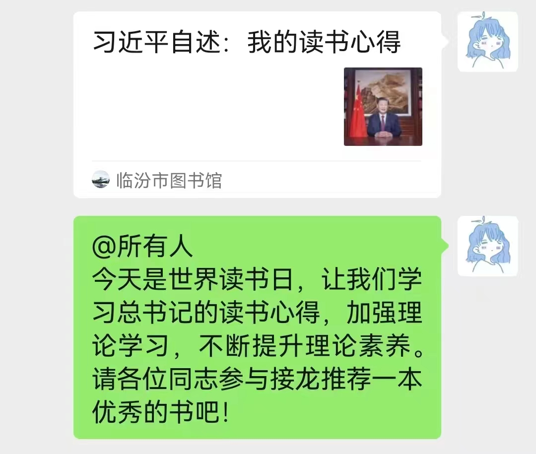 在本次活动中,今年会本科生党支部书记张玉婷首先对世界读书日作了简要介绍,带领大家学习了习近平总书记的读书心得,告诫大家要加强理论学习,不断提升理论素养。之后,张老师让各位党员同志在微信群聊中参与接龙、推荐好书。各位党员同志依次分享了《资本论》、《家庭、私有制和国家的起源》、《毛泽东传》、《邓小平时代》、《习近平与大学生朋友们》等50余本好书。最后,张老师向大家推荐《党史商鉴》一书,让大家从不同角度了解伟大党史,锤炼党性、开阔视野。