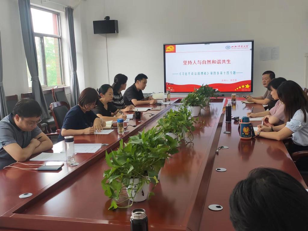 吉志强副院长领学了《习近平谈治国理政》第四卷,梳理全书概况,重点从选文整体情况、重点内容解读、专题学习意义等三个方面讲授了其中的第十四专题—《坚持人与自然和谐共生》。