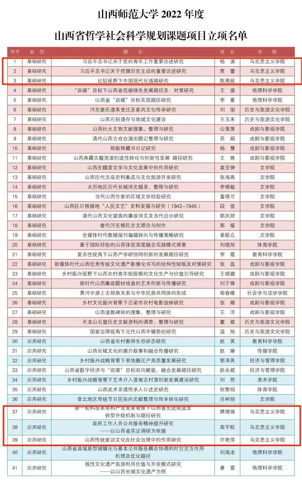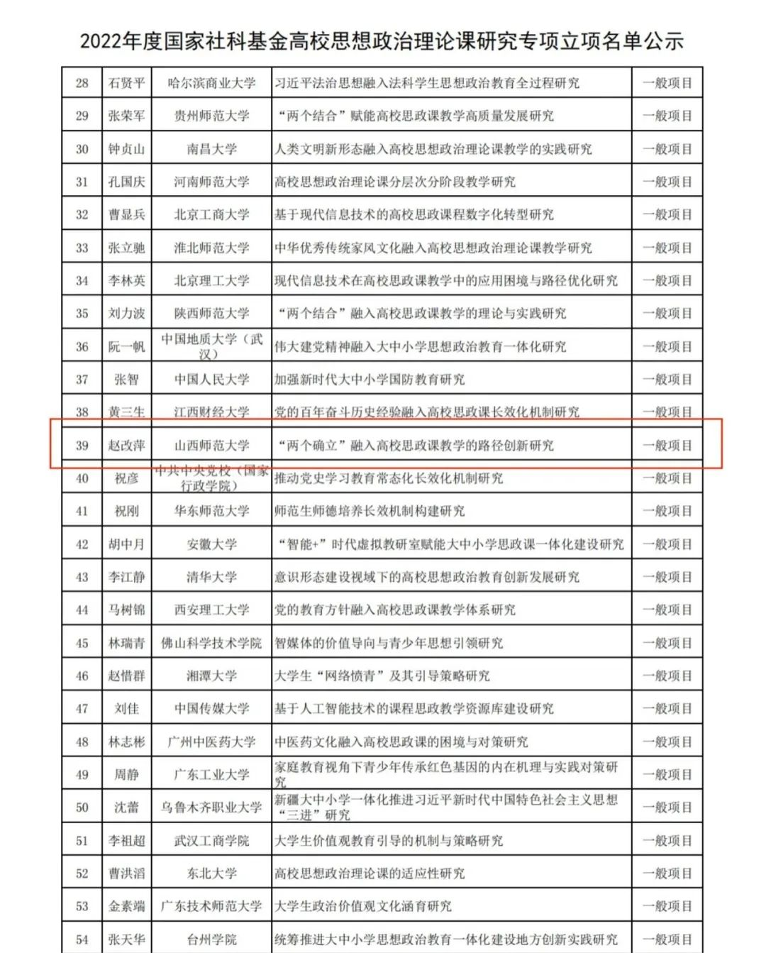 近日,2022年度国家社科基金高校思想政治理论课研究专项立项名单和山西省哲学社会科学规划课题项目评审结果公布。今年会赵改萍副院长的《“两个确立”融入高校思政课教学的路径创新研究》获批国社科高校思政课研究专项一般项目,杨源、贾蕾、陈燕妮、樊增强、高宇航、许艳萍六位老师获批省哲社规划课题基础研究和应用研究项目。