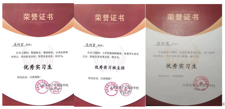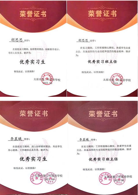 实习期间,由于部分卓越生听课备课认真,深入钻研教材教法以及关注学生身心健康,获得“优秀实习生”荣誉;有的工作积极细致踏实,热爱学生讲究方法,勤勉负责效果显著,获得“优秀实习班主任”荣誉。同学们在汇报中展示了自己的荣誉证书。