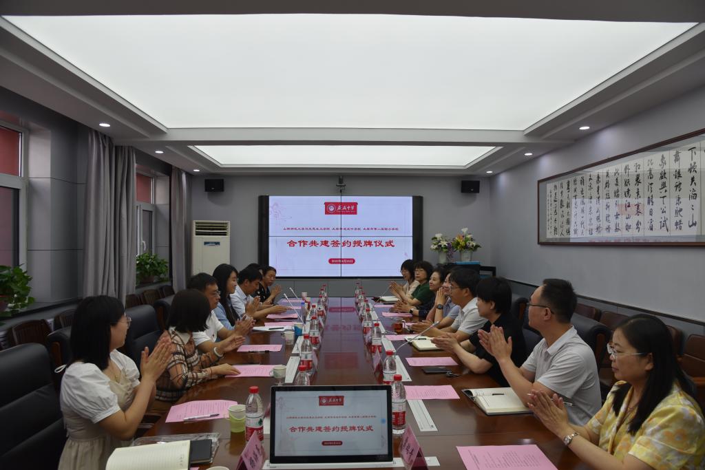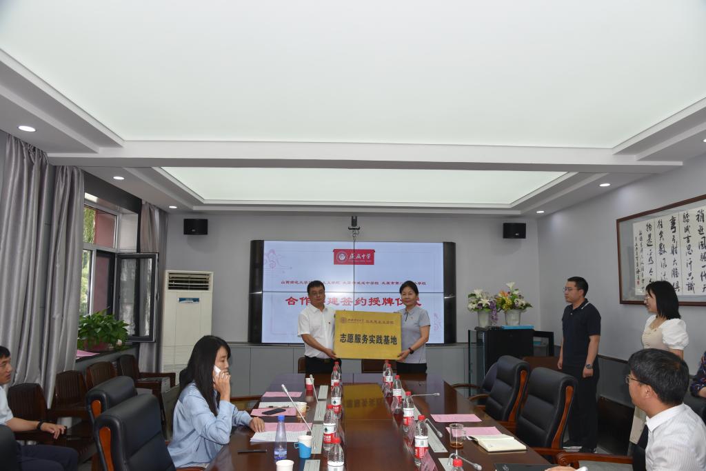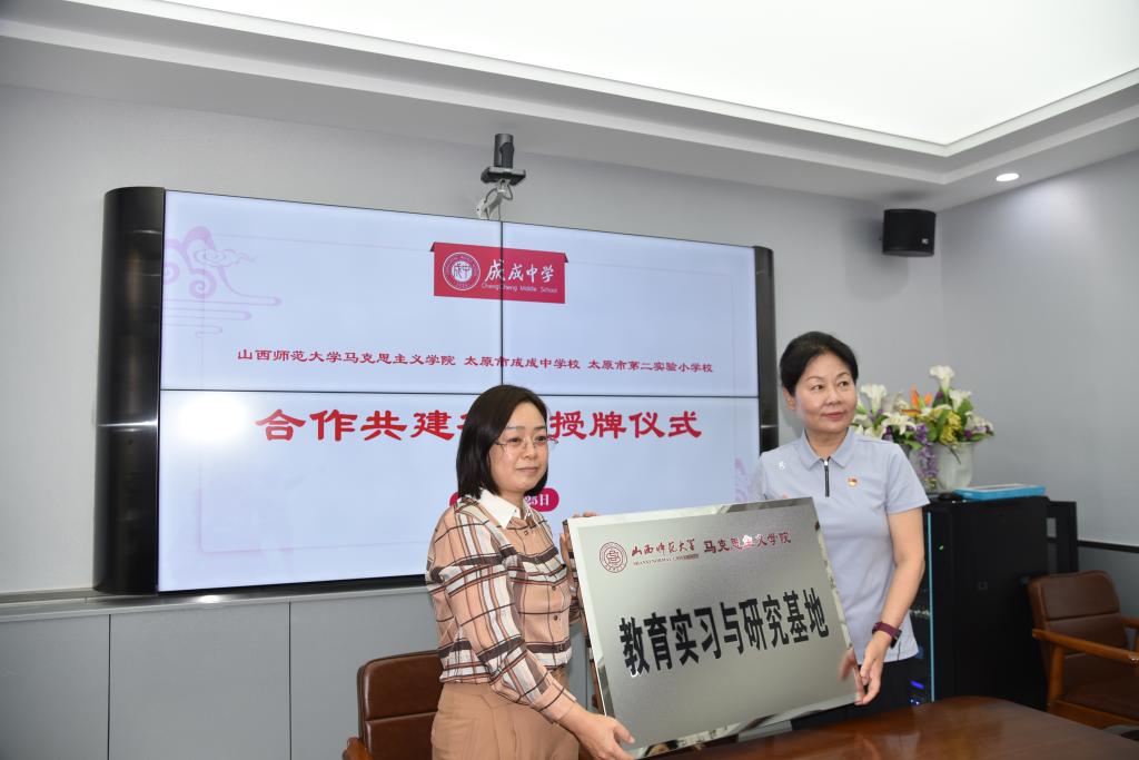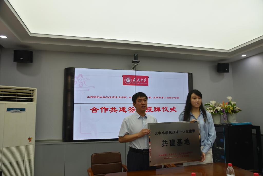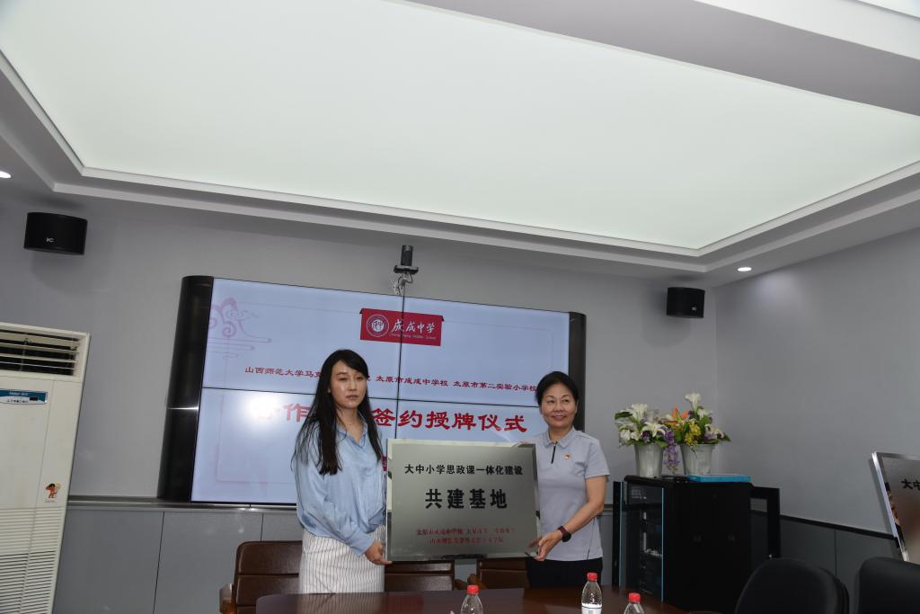 充分交流后,学院与太原市成成中学校、太原市第二实验小学分别签署了合作共建协议。党委书记乔瑞、党委副书记杜辉、副院长赵秀芳分别代表今年会jinnianhuicom授予太原市成成中学校、太原市第二实验小学“大中小学思政课一体化建设共建基地”“志愿服务基地” “教育实习与研究基地”牌匾。