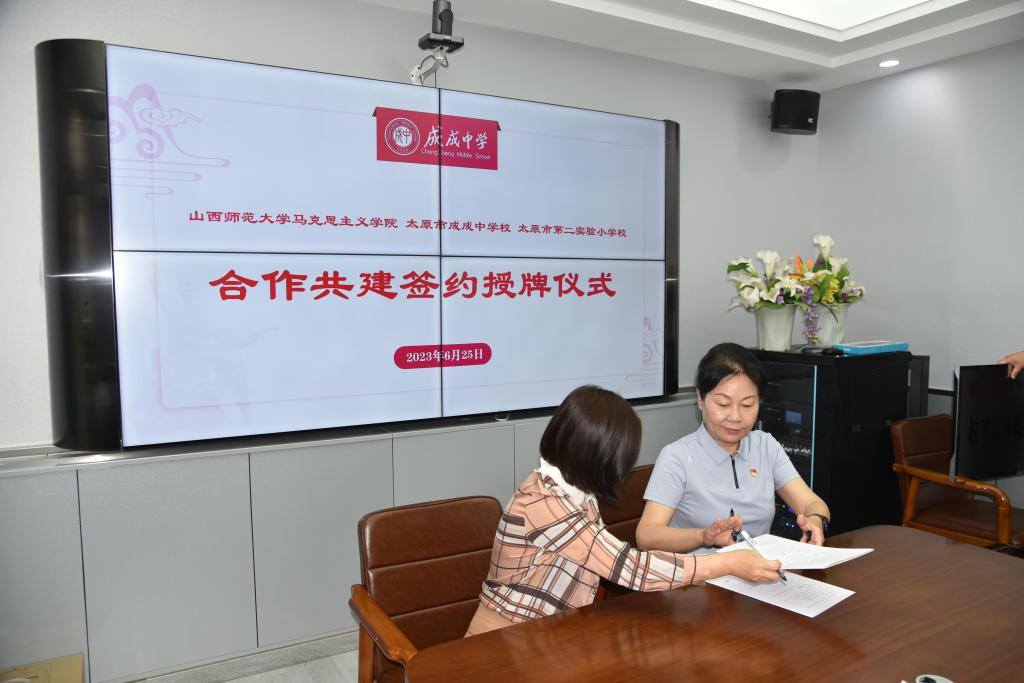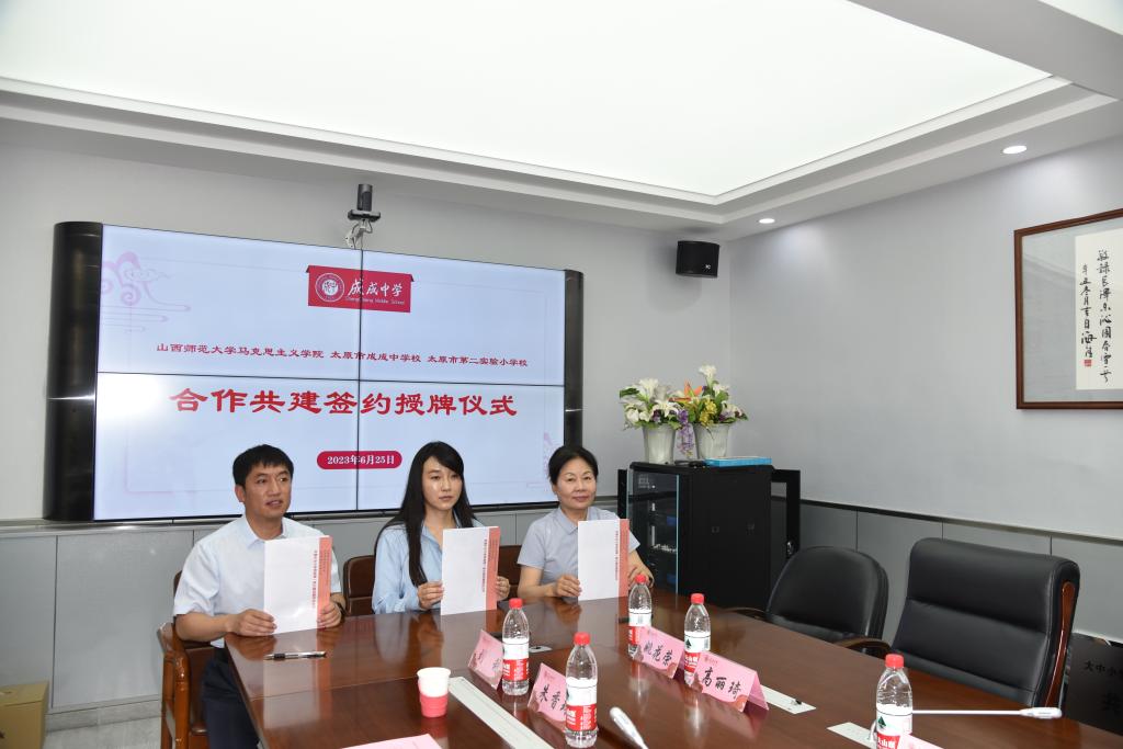 2023年6月25日上午,今年会官方网站与太原市成成中学校、太原市第二实验小学大中小学思政课一体化建设共建基地、教育实习与研究基地和志愿服务基地签约授牌仪式在太原市成成中学校迎泽校区隆重举行。
