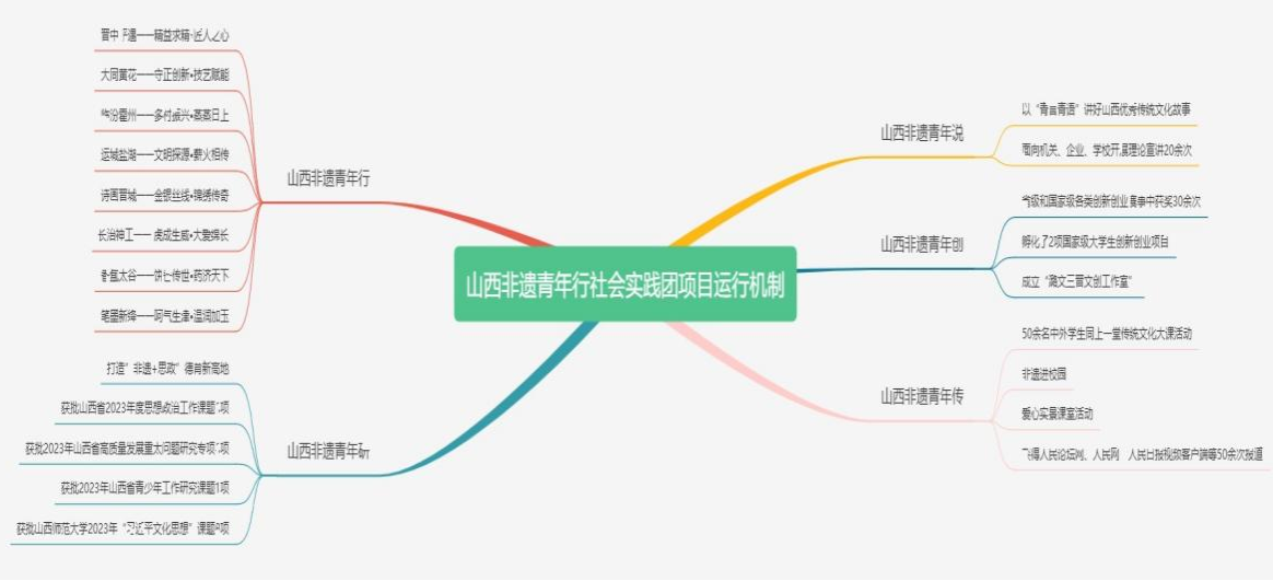 获批3个共青团中央专项,调研非遗项目50项,深入各企事业单位宣讲20余次,获批山西省课题和研究专项13项,非遗青年创业项目获奖30余次并孵化了2项国家级项目,非遗公益讲解志愿时长累计3000小时,非遗主题党团活动累计开展200余次,非遗类公益支教覆盖学生8000余次,项目活动受到国家级等媒体60余次宣传报道,多次获得实践地积极评价和社会反馈。