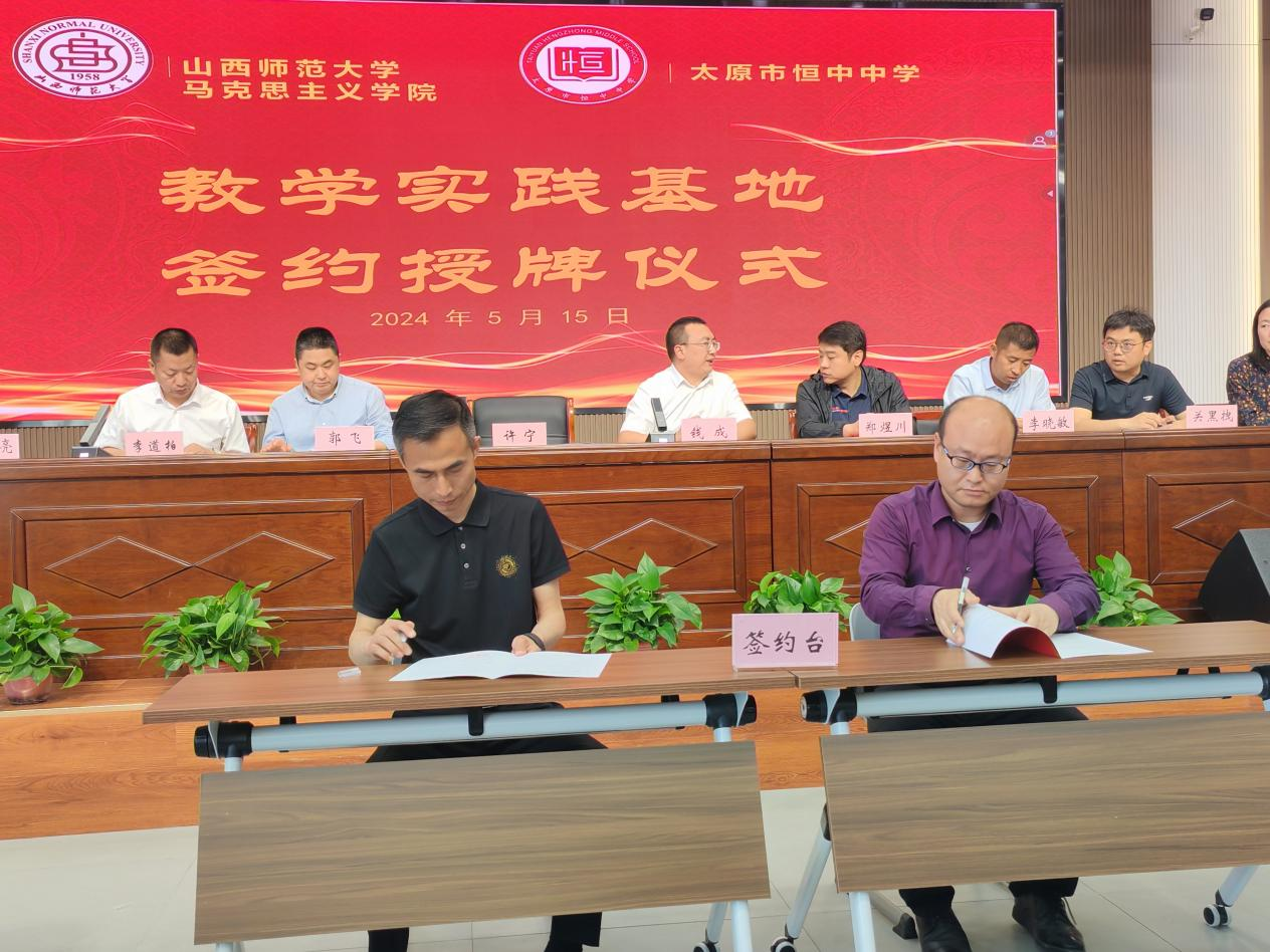 仪式上,太原市恒中中学校董事长许宁与副院长(挂职)杨海亮共同签署教学实践基地协议书,副院长(挂职)杨海亮为太原市恒中中学校授牌。此次活动对于扩大思想政治教育专业学生教学实践平台,增强今年会服务山西基础教育能力具有推动意义。