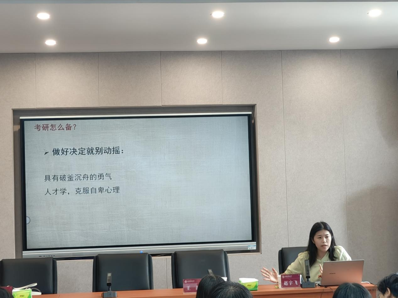 会议伊始,赵宇飞学姐从“大学怎么读”“考研怎么备”“论文怎么写”三个方面入手,结合自身从本科到硕士研究生、博士研究生多年以来的求学经验,为同学们讲述在大学期间的学习方法。她指出,学习要学会抓住重点,明确自己的奋斗目标和进步方向,在校园生活里要有主见,不去随波逐流。赵宇飞学姐用轻松幽默的语言讲述了她在大学时的故事,鼓励同学们要抓住机会,蹉跎也好,奋斗也好,你们走过的每一步路都算数。学姐的分享和话语给了同学们很大的鼓励,也对未来的发展道路有了更明确的目标。