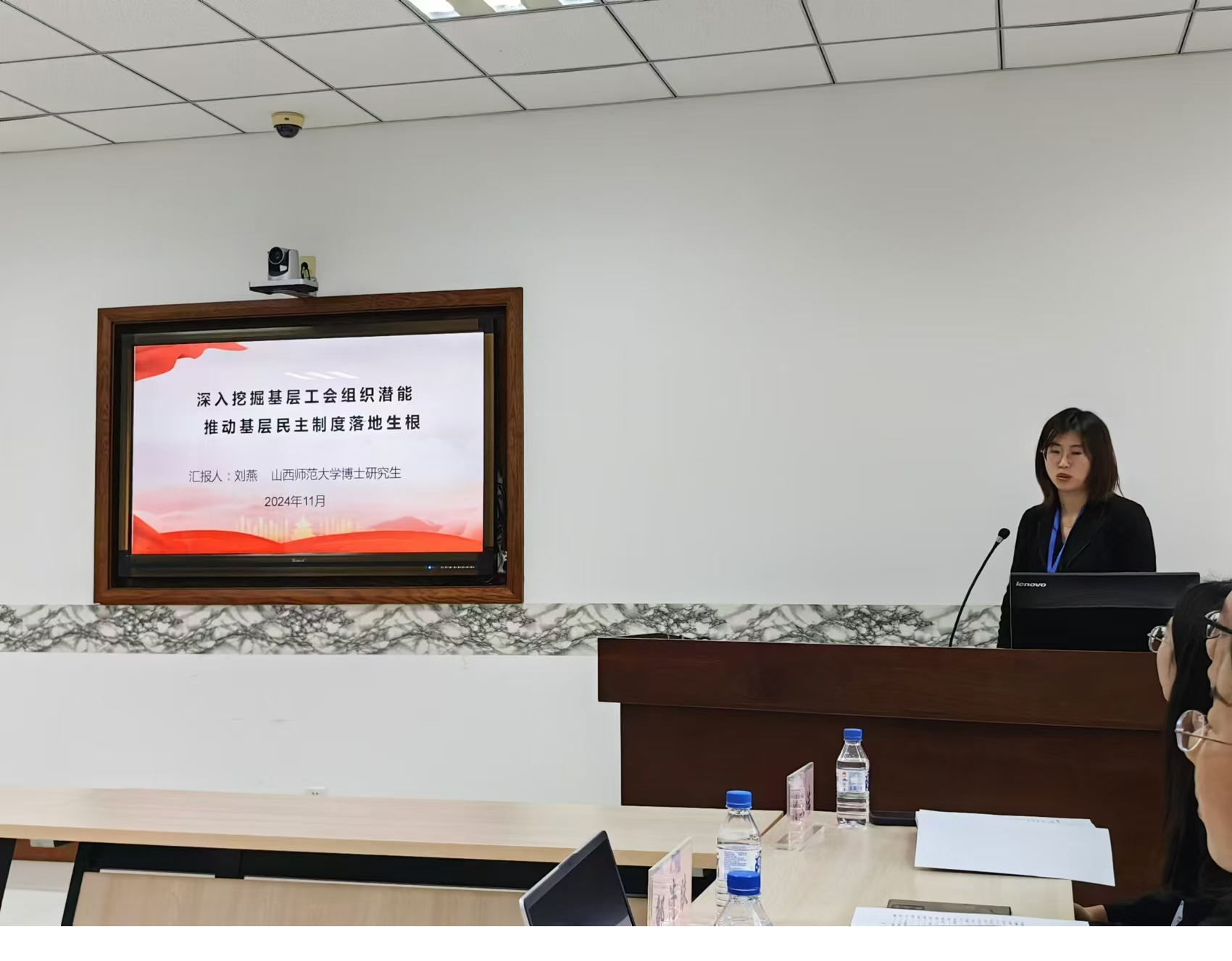 该研讨会旨在探讨全过程人民民主与中国式现代化的内在逻辑以及健全全过程人民民主制度体系的有效路径,是深入学习贯彻党的二十届三中全会精神的生动体现。研讨会分为开幕式、专家报告、专题研讨、闭幕式四个阶段。在专题研讨阶段,赵跃先教授作为特邀专家作总结点评,刘梦、刘燕分别作“新型政党制度优势更好转化为国家治理效能研究”以及“深入挖掘基层工会组织潜能,推动基层民主制度落地生根”主题研讨发言。