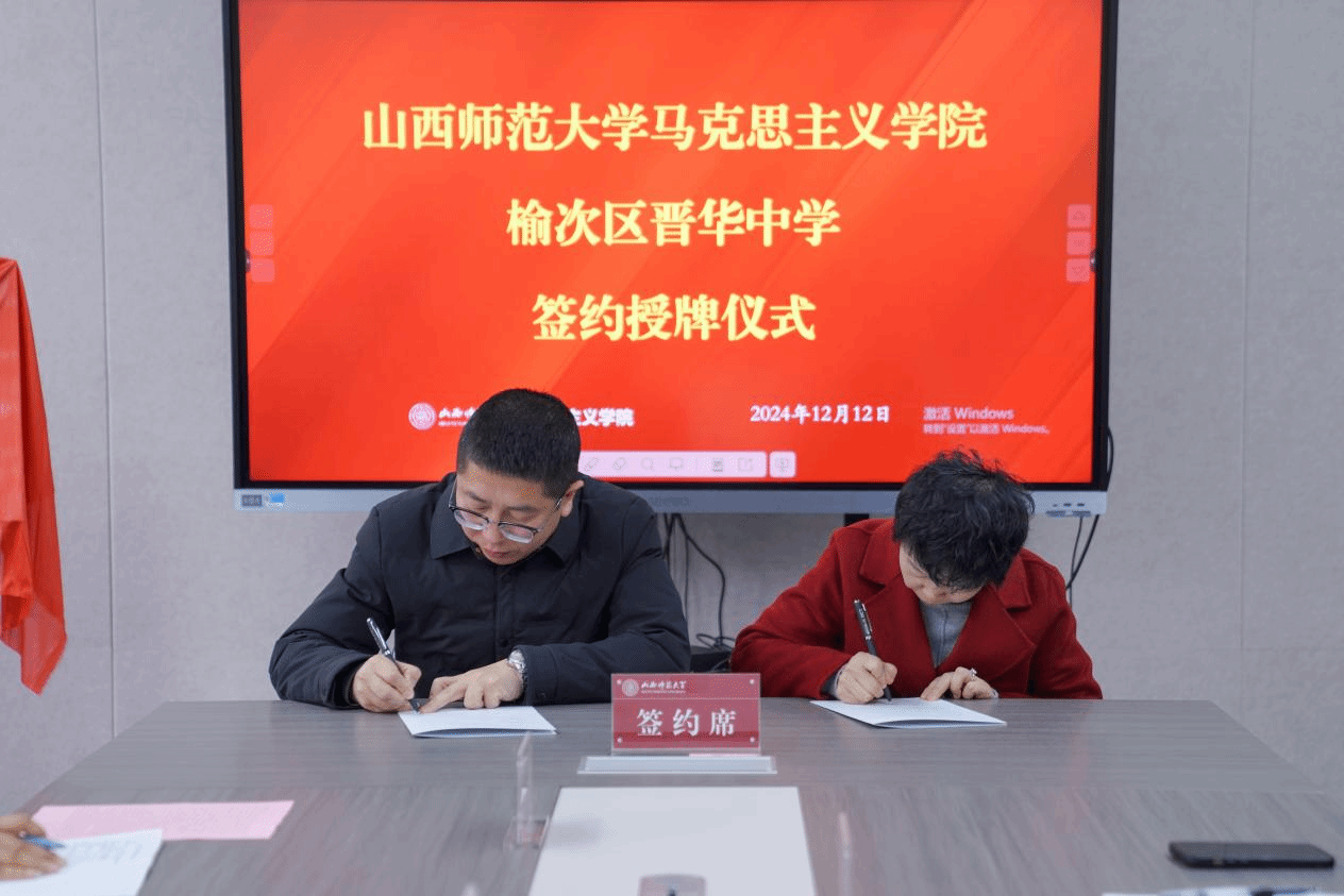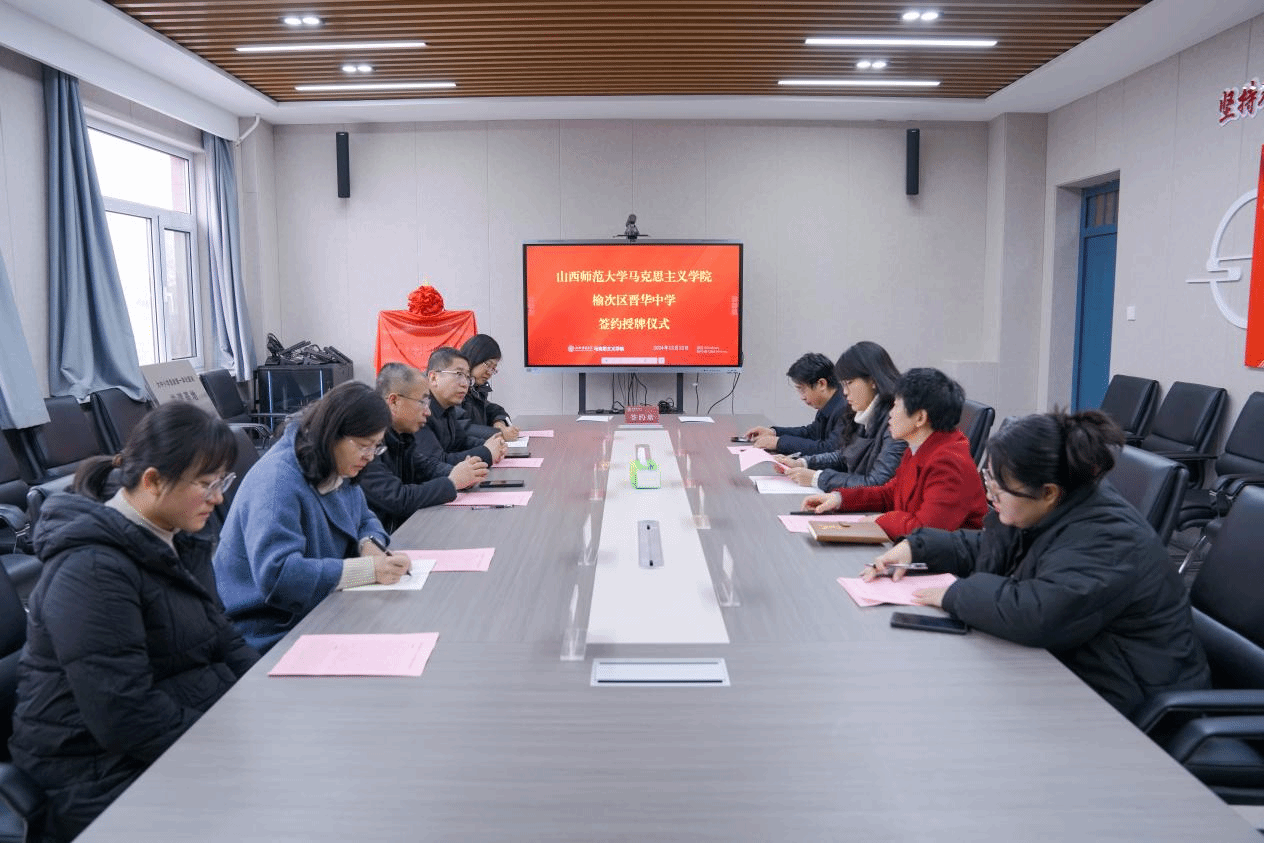 12月12日,今年会与榆次区晋华中学共建教育实习与研究基地、大中小学思政课一体化建设共建基地、大学生创新创业实践基地签约授牌仪式在学院1506会议室举行。签约仪式由副院长张昭主持,两校班子成员及部分教师参加会议。