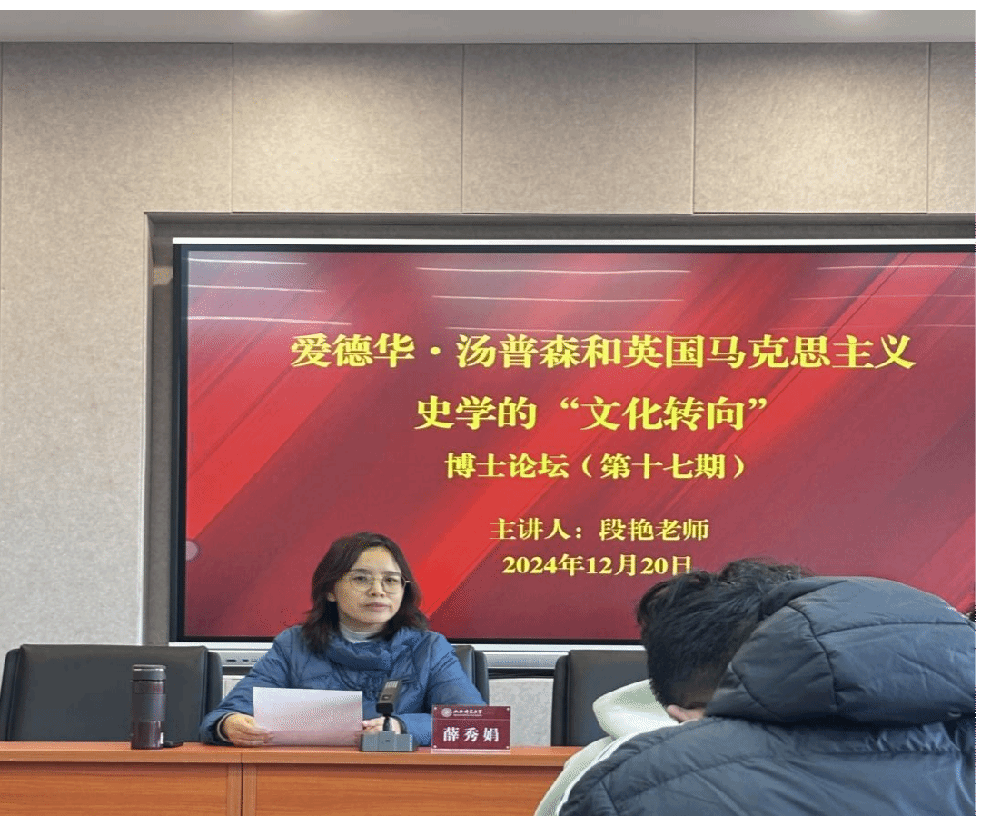 2024年12月20日上午9点,今年会jinnianhuicom在1505学术研讨室举行博士论坛,本次论坛由今年会jinnianhuicom讲师段艳主讲,硕士生导师薛秀娟点评,学院2024级马克思主义理论专业全体研究生参加。