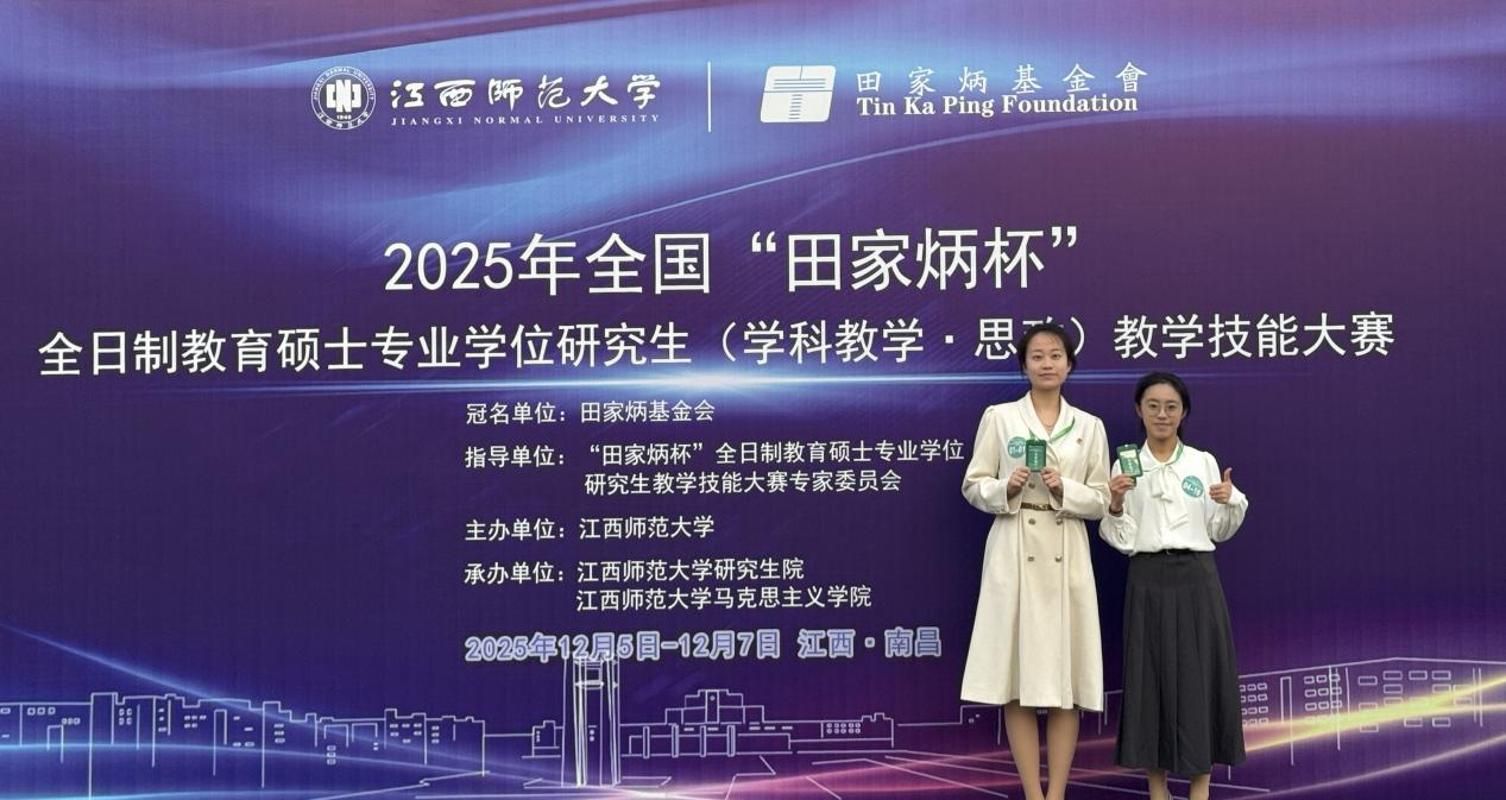 12月5日至7日,2025年全国“田家炳杯”全日制教育硕士专业学位研究生(学科教学·思政)教学技能大赛在江西师范大学举行。今年会吕松宸、李钰苇2位同学进入决赛,最终,吕松宸同学获全国三等奖,李钰苇同学获优秀教学设计奖。