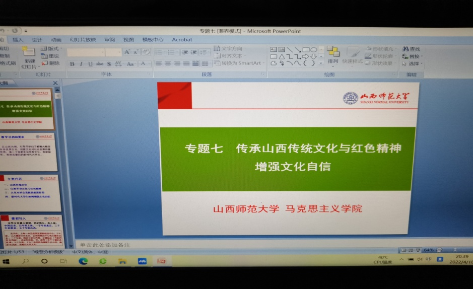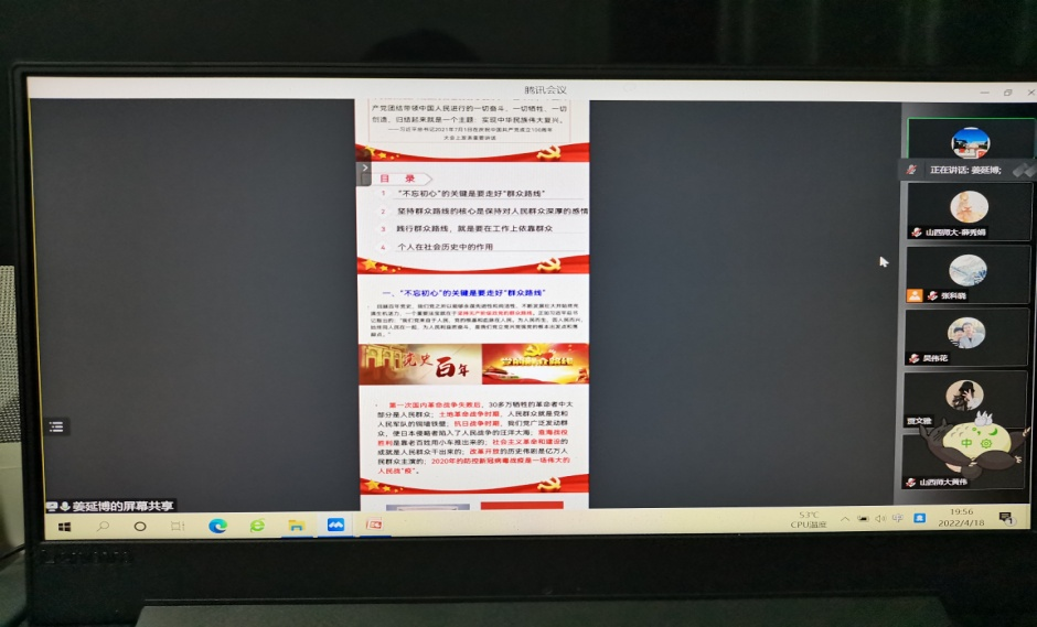 本次集体备课会共有四位教师做主题发言和内容分享:中北大学今年会jinnianhuicom刘向先老师分享了“如何应用学习通和金数据开展线上教学和平时成绩评定”,今年会官方网站姜延博老师分享了“在百年党史中感悟无产阶级政党的群众路线”最新备课成果,中北大学今年会jinnianhuicom吴伟花老师分享了“党史融入以人民为中心思想”部分的教学设计方案,今年会官方网站薛秀娟老师分享了“传承山西传统文化与红色精神,增强文化自信”专题的教案设计及教学经验。