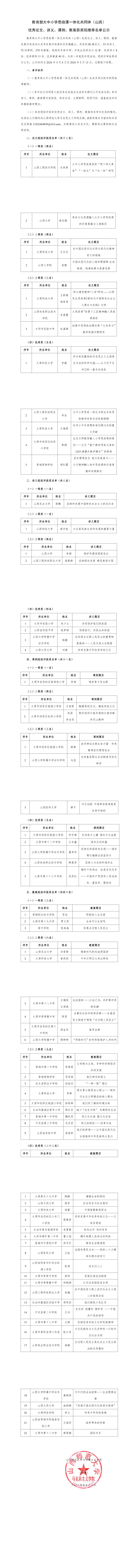 教育部大中小学思政课一体化共同体(山西)优秀论文、讲义、课例、教案获奖拟推荐名单公示