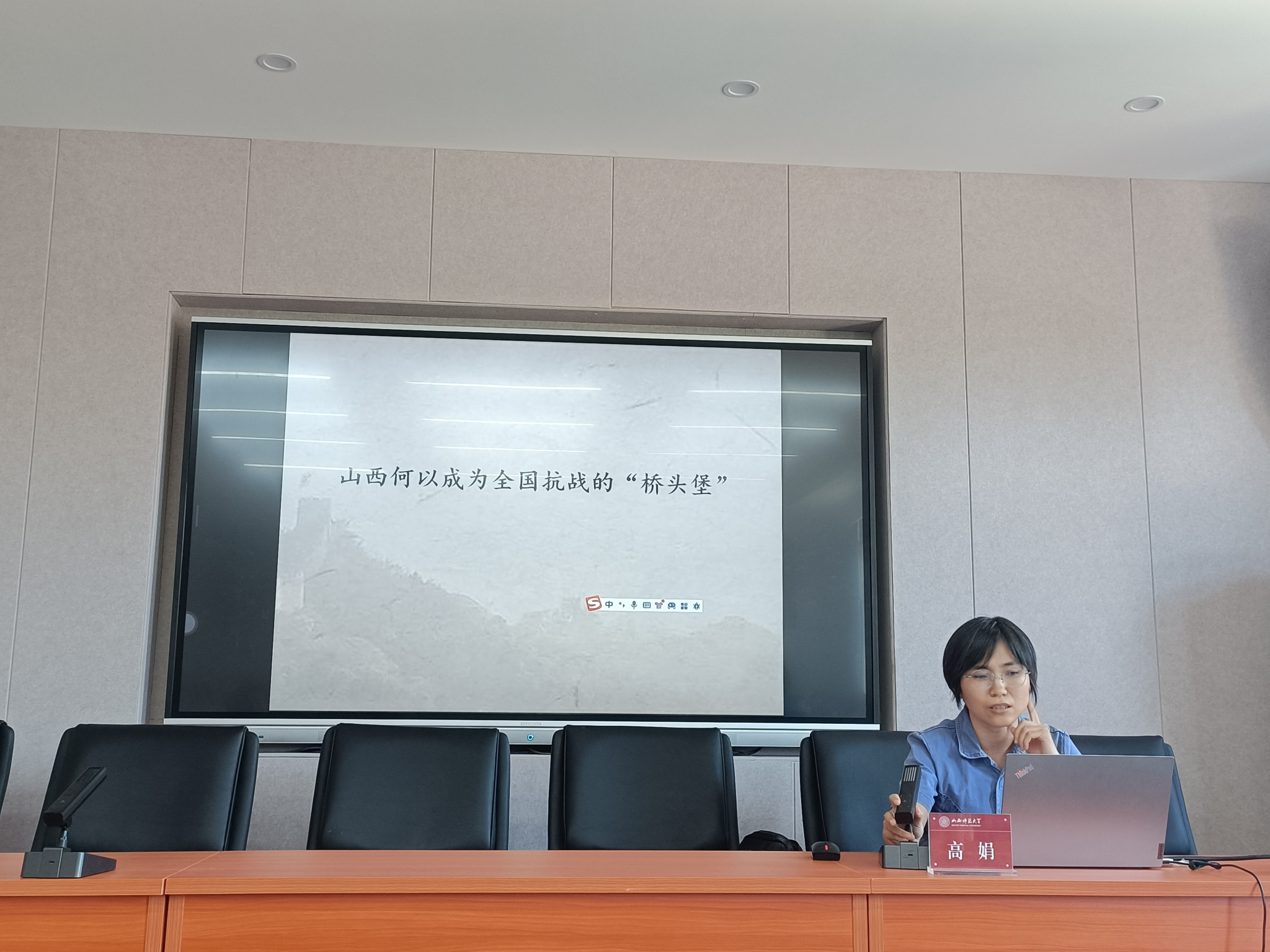 其次,高娟老师作了题为《山西何以成为全国抗战的“桥头堡”》的报告。她从以下两个方面论述了山西在全国抗战中的重要作用。第一,她指出山西是华北敌后抗战的中心、战略支点,是百团大战的主要战场,山西最早成功实践党的抗日民族统一战线。她还介绍了毛泽东同志提出的“经营山西”战略构想及其实施情况,讲述了其在政治上、军事上的重要意义。