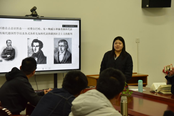 接下来,王逸然博士从《德意志意识形态》是继《神圣家族》后马克思、恩格斯共同完成的第二本经典著作谈起,围绕《德意志意识形态》的历史背景和写作目的、文章结构及主要内容、理论价值和现实意义等三个方面对著作进行了详细讲解。《德意志意识形态》实现了哲学史的伟大变革,为无产阶级认识世界、改造世界提供了正确的立场观点方法,对于我们学习掌握马克思主义世界观和方法论具有重要意义;为我们正确认识和处理社会主义社会的基本矛盾提供了重要启示;为我们既坚持远大理想又脚踏实地地为现阶段目标而奋斗提供了重要理论指导。王逸然博士在讲解过程中与大家一起研读著作经典段落,分享自身观点,使大家在思想的交流和碰撞中感受到了经典原著的魅力,营造出融洽的读书氛围。