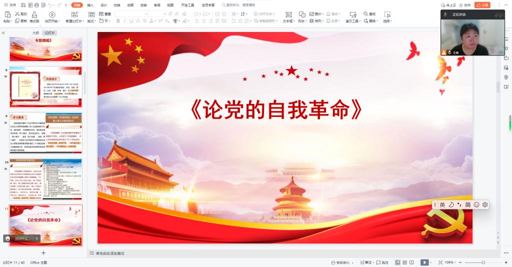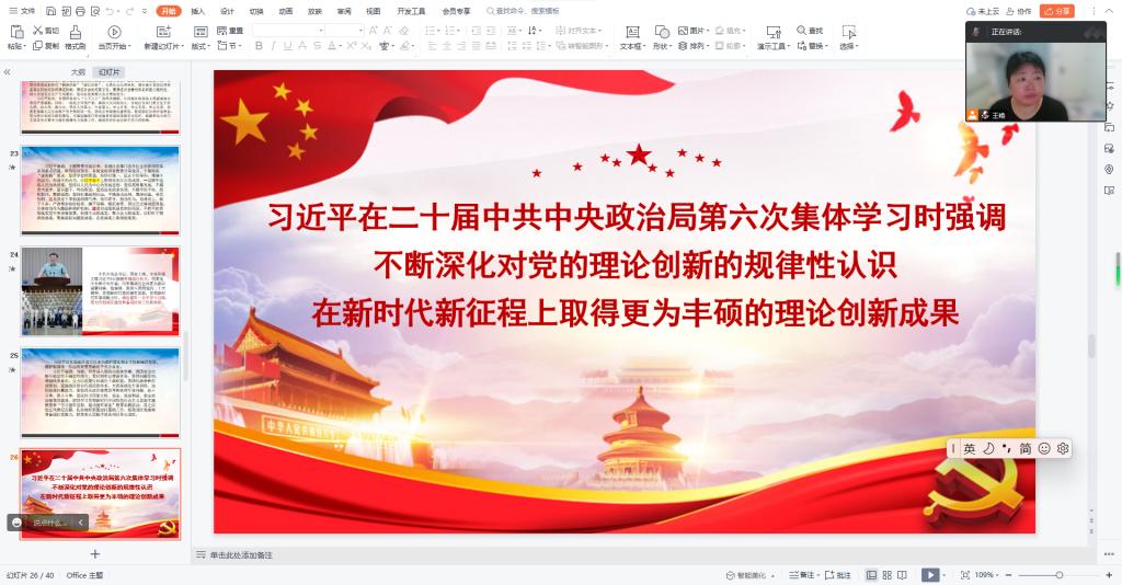 本次学习分为两个阶段:23日下午第一阶段以集中学习为主。支部委员领学《习近平著作选读》第一二卷、《习近平新时代中国特色社会主义思想专题摘编》、《论党的自我革命》、习近平在江苏考察时强调在推进中国式现代化中走在前做示范谱写“强富美高”新江苏现代化建设新篇章、习近平在二十届中共中央政治局第六次集体学习时强调不断深化对党的理论创新的规律性认识在新时代新征程上取得更为丰硕的理论创新成果、及校党委学习贯彻习近平新时代中国特色社会主义思想主题教育办公室安排的其他学习内容。同时,支部党员以自学形式学习了《习近平新时代中国特色社会主义思想的世界观和方法论专题摘编》。24日晚第二阶段以交流研讨为主。支部党员围绕坚定文化自信建设文化强国、党的自我革命、学思想强党性忠诚为党护党全力兴党强党主题开展交流研讨。六位党员作重点发言。其他党员作交流发言。